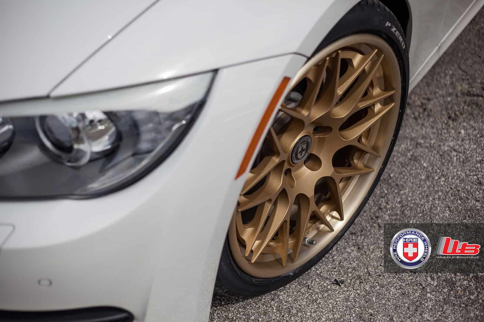 The HRE wheels are 19×9.5 inches and 19×10.5 inches front and rear, respectively, and painted in Sating Gold.
