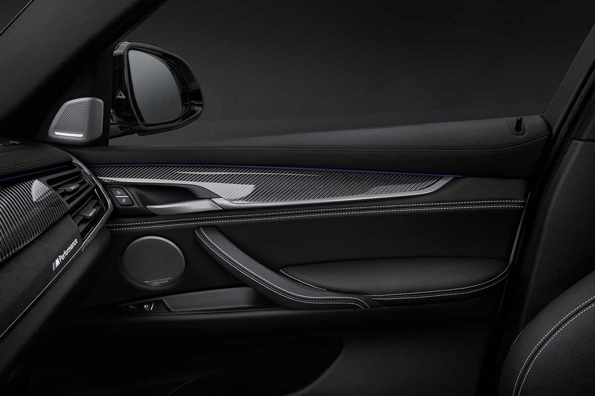 The new BMW M Performance Parts also include a host of attractive and sporting details for the interior of the BMW X6. The LED door sill plates in brushed stainless steel look with illuminated BMW M Performance lettering grab the attention the moment you open the front doors. Battery power means they are extremely easy to retrofit, with no need for laying cables. The BMW M Performance carbon interior trim strips mark out the interior clearly from the standard car’s and, like the Steptronic sport transmission’s carbon gearshift lever with BMW M logo, add a sporty and exclusive accent to the cockpit.