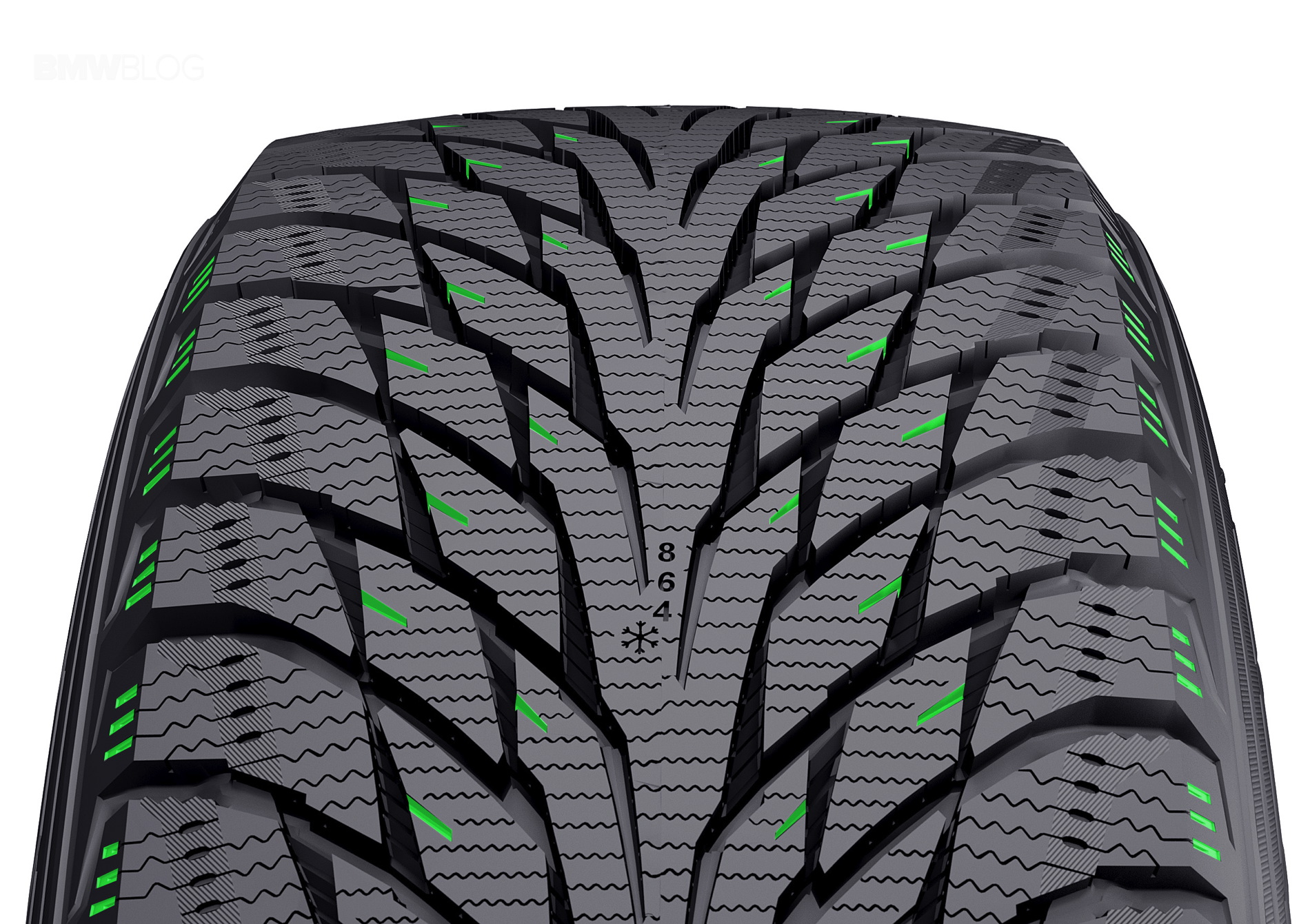 The aggressive arrow-like tread pattern, already used on the test-winning Nokian Hakkapeliitta R2, and the safety innovations that improve handling, such as the grip particles and pump sipes of the Cryo Crystal concept, ensure balanced handling and excellent winter grip, even on wet ice.