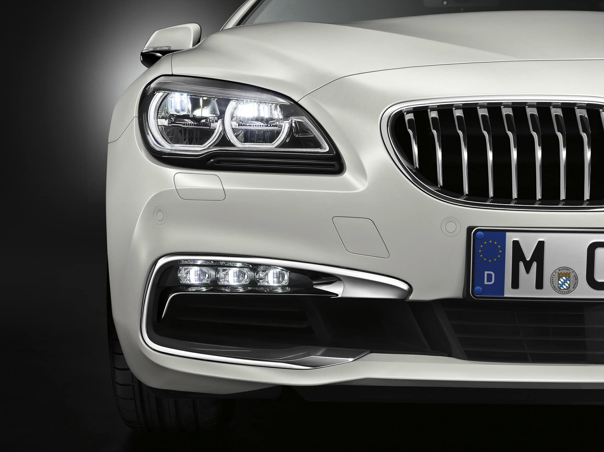 The new contours of the kidney grille bars (in aluminum matt on the 650i variants and black on 640i models) underline the forward-surging stance of the grille. The new front apron, whose lower air intake is now a single stylistic unit that accentuates the 6 Series’ width, radiates sports performance and solidity. The front foglamps, which are positioned at the far outer edges of the front end, consist of three adjacent LED units and now feature a decorative surround. This trim element is chrome on the new BMW 6 Series Convertible and comes in high-gloss black for the new 6 Series Coupe and Gran Coupe.