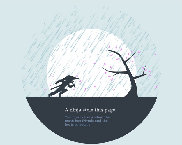 Ninjas seems to be a crowd-pleaser, and Huwshimi’s 404 page takes full advantage of this. The framing, technique, use of colors, etc. make this page a work of art, and we don’t mind seeing it pop up when browsing.