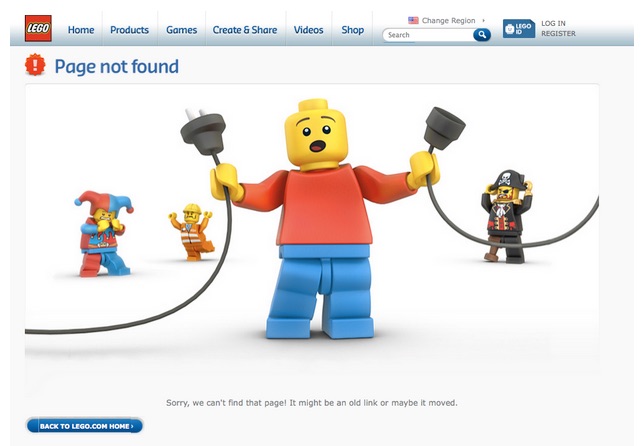The Lego 404 page, for example, uses humor and a funny visual, but it also uses its iconic characters. It’s simple, cute, and it reaffirms brand awareness. Just looking at this page brings back memories. On a more subtle level, also notice how they chose red for the foreground character to better highlight the sense of error.