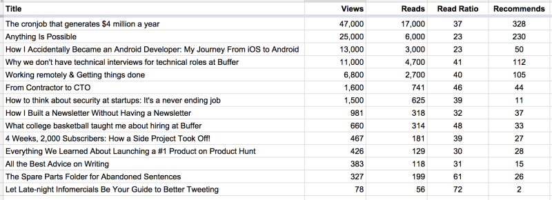 Actual numbers on this are a bit hard to come by. A few folks have been kind to share their stats, and I’ve bundled up all the stats from our various team member posts here at Buffer to help give you an idea of the volume that’s out there at Medium.