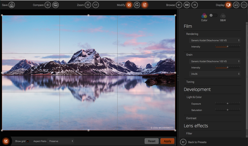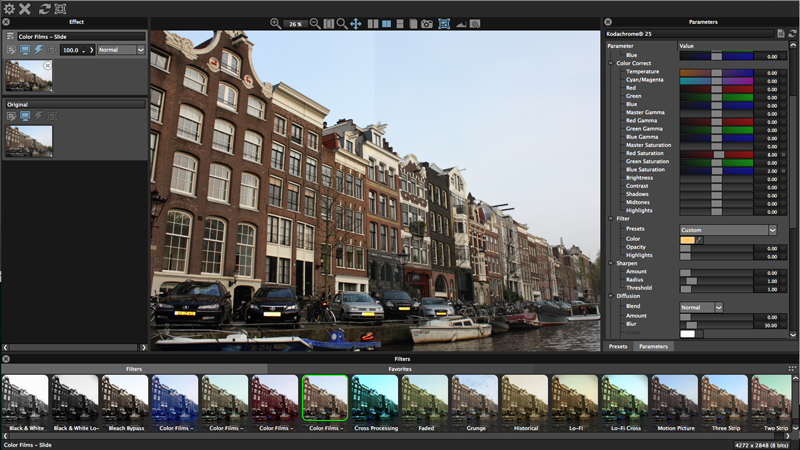 You can create professionally stylized images by selecting a preset and then fine-tuning it to personalize the effect. Choose one, two, or even all 14 available tools for controlling and adjusting your images — they sit in a panel on the left while you fine-tune the results on the right. Compare the original and the filtered version in real time.