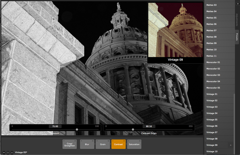 CameraBag is a non-destructive filter that has a dual component. You can use it to do straight edits of your images in preparation for applying filtered effects. As a standalone app, you don’t need to plug it into a host app. It has very smooth performance with an interactive and dynamic workflow — no jerky movements no matter how much you tinker and it works especially well with Raw images.