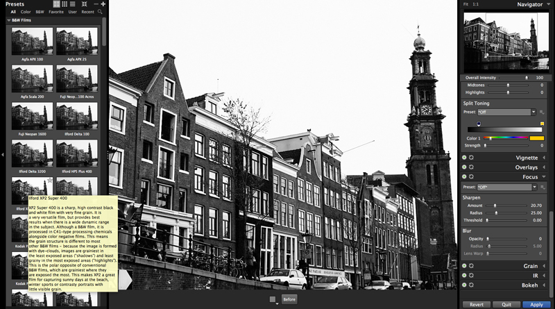 The first thing you want to do upon launching this plug-in is try out your images with the large number of built-in presets, accessed from the left side of the window and sorted into nine categories like All, Basic Fundamentals, 19th Century Processes, 20th Century Classic Silver, 21st Century Modern Digital, High-Speed Documentary, Hint of Color, Hollywood Portrait and True Film.