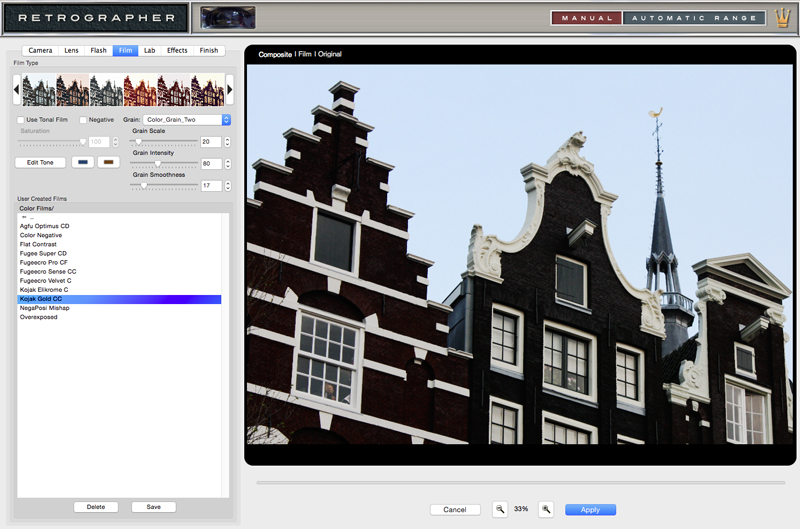 You can select from films like Agfa, Fuji, Ilford, Kodak, Polaroid and Rollei color and black and white film, choosing from a wide range of historical photographic processes including Bleach Bypass, Cross processing and technicolor three-strip and two-strip processes.