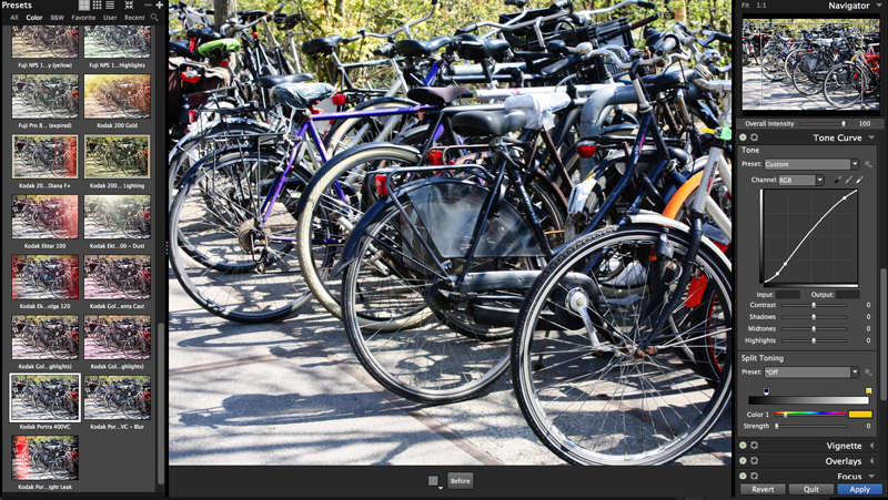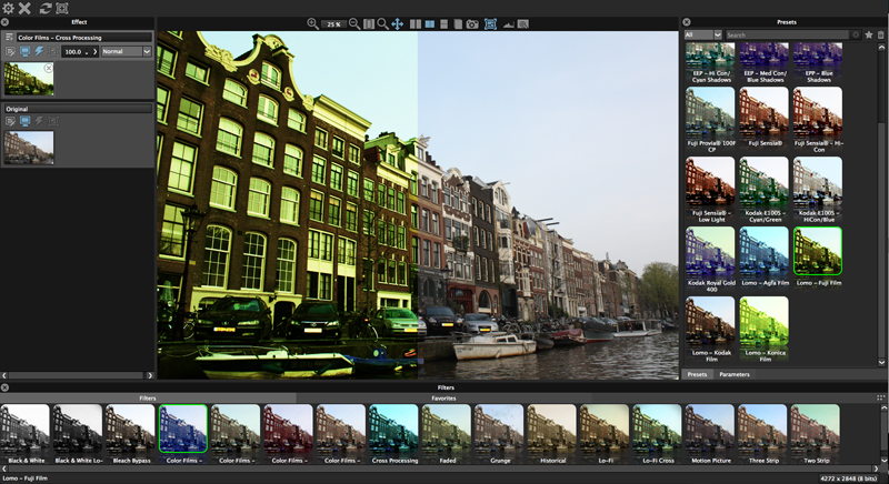 Compare before and with an auto setting and tweak your images with a complete set of sliders. Apply Lo-Fi photographic looks from Lomo and Holga toy cameras and as well as the looks of faded films or grunge effects, or create your own presets.