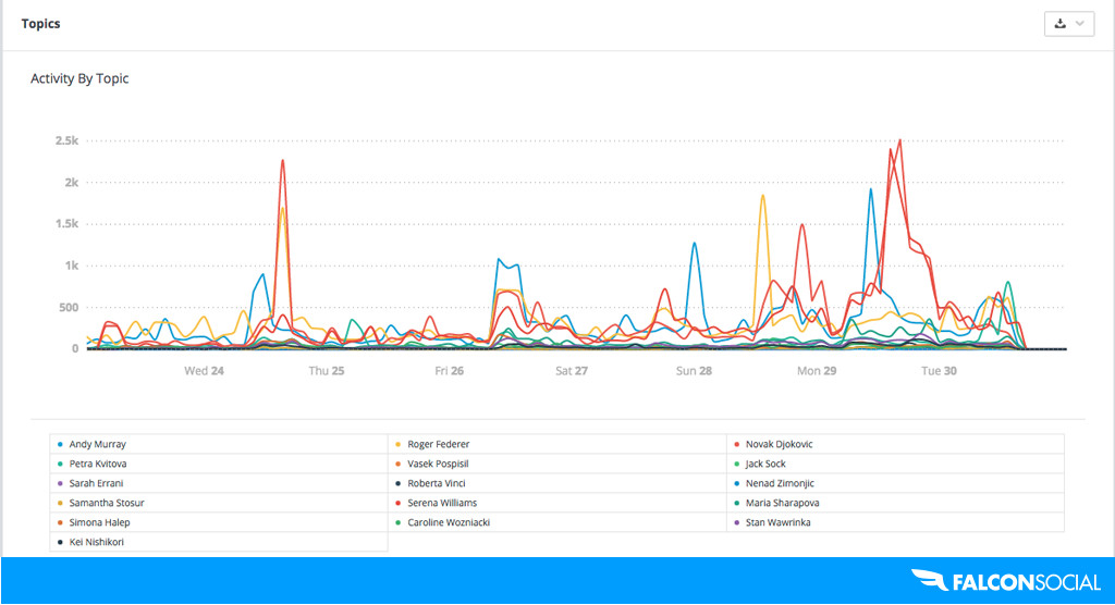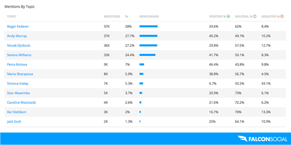 Kvitova and Sharapova both share interesting content regularly, but with only 6 percent of mentions each, it’s clear that they’ve yet to nail their niche.
