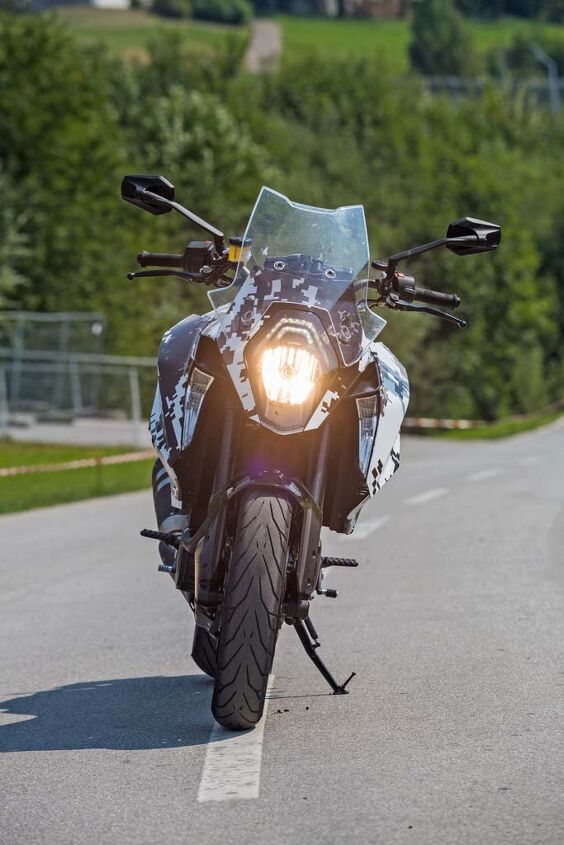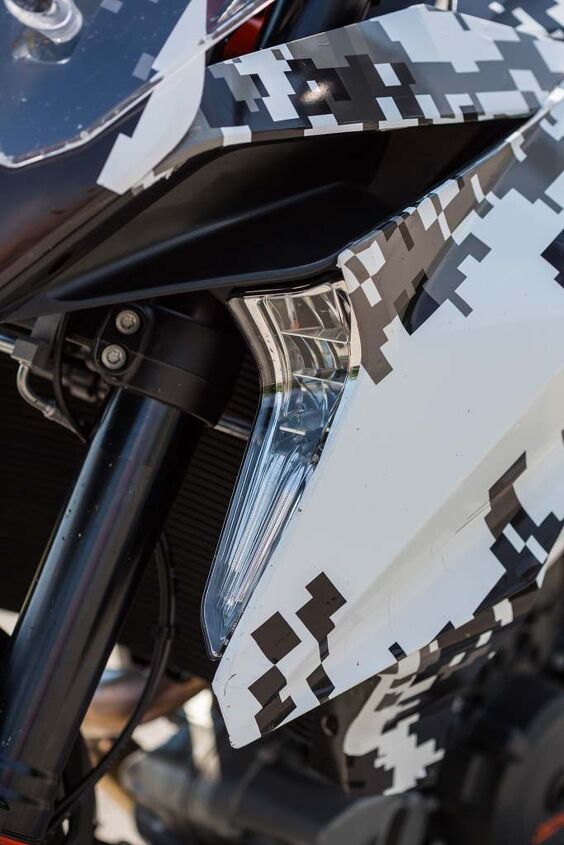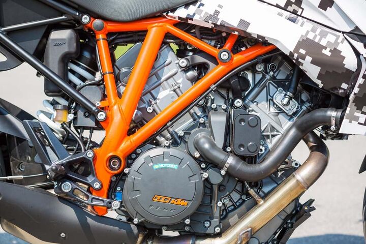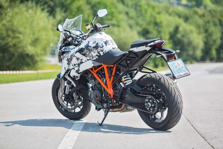 Instead of no fairing at all, the GT will have a frame modified to accommodate a good-sized eight-way-adjustable windshield, not unlike the one on the 1290 Super Adventure we recently tested in our Ultimate Sports Adventure Touring Shootout. A bigger fuel tank is designed to better shield the rider’s legs and increase range. A new handlebar will also increase long-distance comfort. The subframe’s been stretched to accommodate luggage and a passenger, and new seating for pilot and pillion alike is designed for increased comfort. A low exhaust system makes room for the right saddlebag.