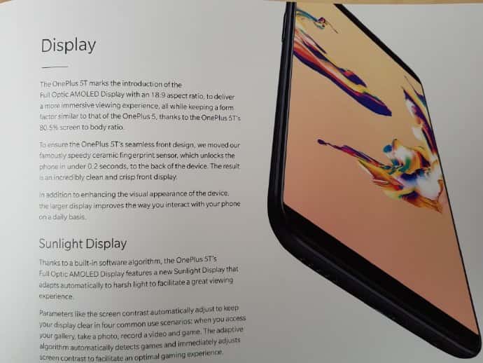 Seemingly all specs of the OnePlus 5T leaked online on Saturday, having emerged in the form of photos of what appears to be a brochure detailing the upcoming Android flagship, possibly the same one taken from the previously sighted Reviewer Kit of the same device. The image seen above isolates the render of the handset appearing in the booklet, confirming that the successor to the OnePlus 5 will adopt a bezel-free design with an edge-to-edge screen featuring an aspect ratio of 18:9, or 2:1. The panel itself is set to be advertised by the Chinese company as the “Sunlight Display,” which is technically a 6.01-inch Full Optic AMOLED FHD+ (2,160 x 1,080) module capable of automatically switching between four main operation modes, depending on the scenario. The screen is protected by 2.5D Corning Gorilla Glass 5 and has a pixel density of 401ppi, being virtually identical to its predecessor in this regard.