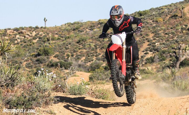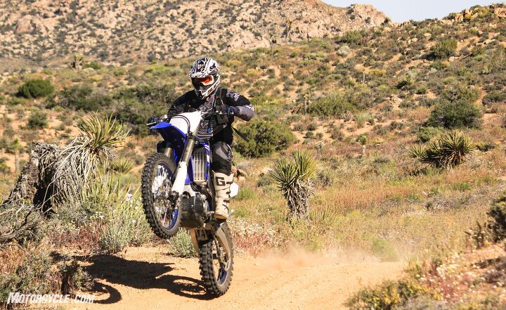 Happily, neither of these bikes presented us with any rude surprises or weird handling quirks. Though different in overall feel, both were eminently predictable and did what we told them to do, whether on fast two-trackers or more technical single track trail. We found the Yamaha easier to loft the front wheel when needed, likely due to its centrally-mounted fuel-tank and harder bark off the bottom.