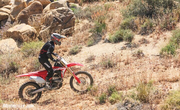 Getting power to the ground reveals the next biggest difference between the two. The Honda uses a close-ratio five-speed transmission, while the Yamaha has a six-speed wide-ratio trans. For tight GNCC-type race courses, many might prefer the close-ratio transmission of the Honda. It’s the same as the one found in the CRF250R and delivers positive shifts with a very light pull at the lever. The Yamaha transmission is equally smooth, delivering solid shifts but at a wider spread through its six gears making it more suitable for desert racing or hare scrambles. For a guy like me in California, who would be more interested in using the bike for trail riding primarily, the wide-ratio transmission gives the preferred spread with first gear lower for tight technical sections and sixth for wide-open spaces.