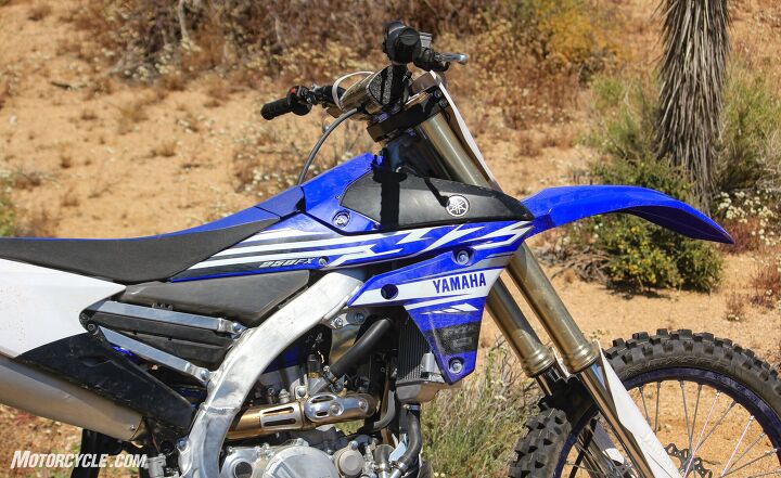 Note how far rearward the Yamaha YX250FX’s motor is slanted. This, combined with other features such as the centralized low fuel tank, Yamaha claims, helps with mass centralization. Both test riders agreed with the Blu Cru’s claims.