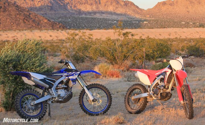 Both the Honda’s Showa suspension components and Yamaha’s KYB units are fully adjustable front and rear, and neither bike employs an air fork. The Honda delivers a more plush, comfortable ride while the Yamaha’s suspenders feel more set up for racing, and it’s clear when railing through a set of corners. The Yamaha generally felt more planted under acceleration and braking, even though it’s wheelbase is actually slightly shorter, and rake is 0.7 degrees steeper, which might make one think otherwise when looking at the specsheet. At slow speeds, the Honda feels nimble and easily tiptoes around and over obstacles where sometimes the Yamaha felt harsh. After making some adjustments to both bikes’ preload, we had them both sitting in what we felt was a very balanced state.